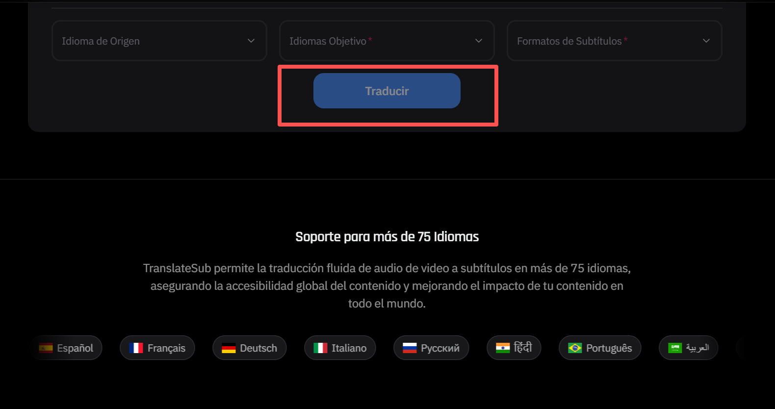 TranslateSub no solo transcribe, sino que conecta culturas. Hemos integrado capacidades específicas para diversas combinaciones lingüísticas: